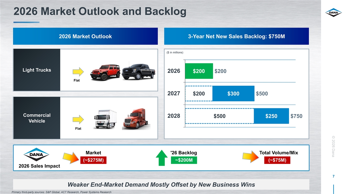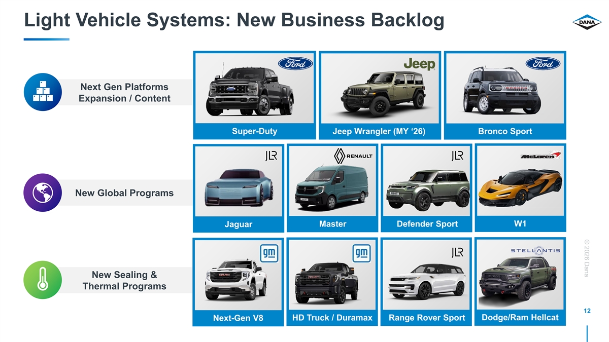 © 2026 Dana Light Vehicle Systems: New Business Backlog Next Gen Platforms Expansion / Content Super-Duty Jeep Wrangler (MY ‘26) Bronco Sport New Global Programs W1 Jaguar Master Defender Sport New Sealing & Thermal Programs 12 HD Truck / Duramax Range Rover Sport Dodge/Ram Hellcat Next-Gen V8