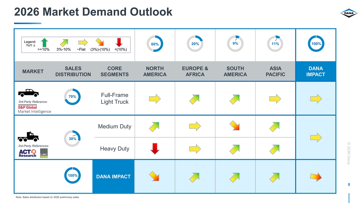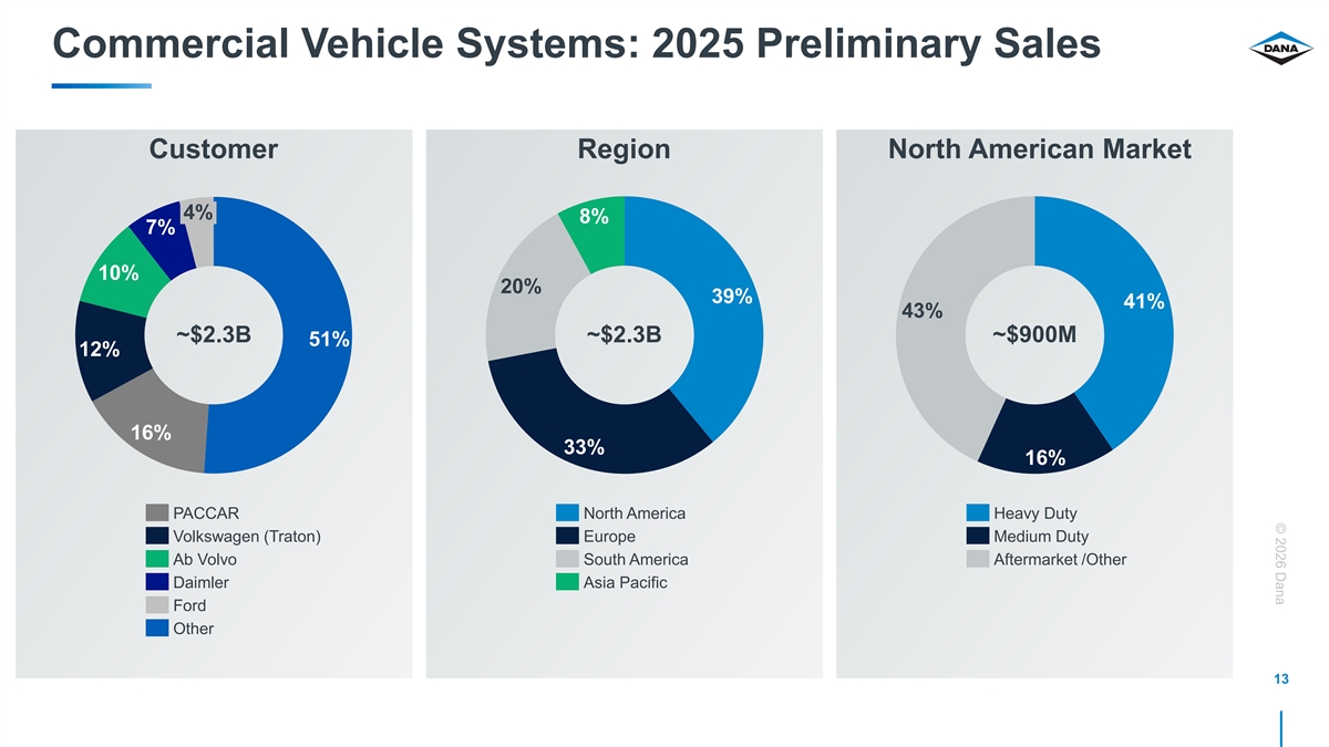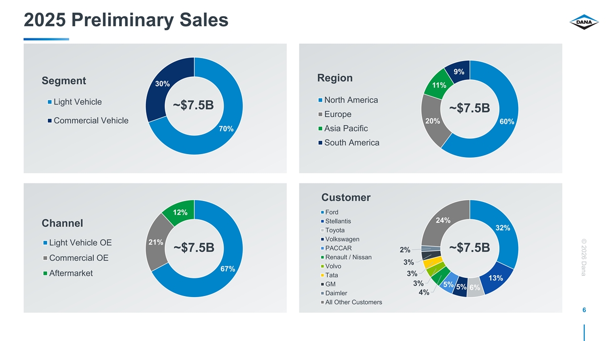 © 2026 Dana 2025 Preliminary Sales 9% Region Segment 30% 11% North America Light Vehicle ~$7.5B ~$7.5B Europe Commercial Vehicle 20% 60% 70% Asia Pacific South America Customer Ford 12% 24% Stellantis Channel 32% Toyota Volkswagen 21% Light Vehicle OE PACCAR ~$7.5B ~$7.5B 2% Renault / Nissan Commercial OE 3% Volvo 67% Aftermarket 3% Tata 13% 3% GM 5% 5% 6% 4% Daimler All Other Customers 6