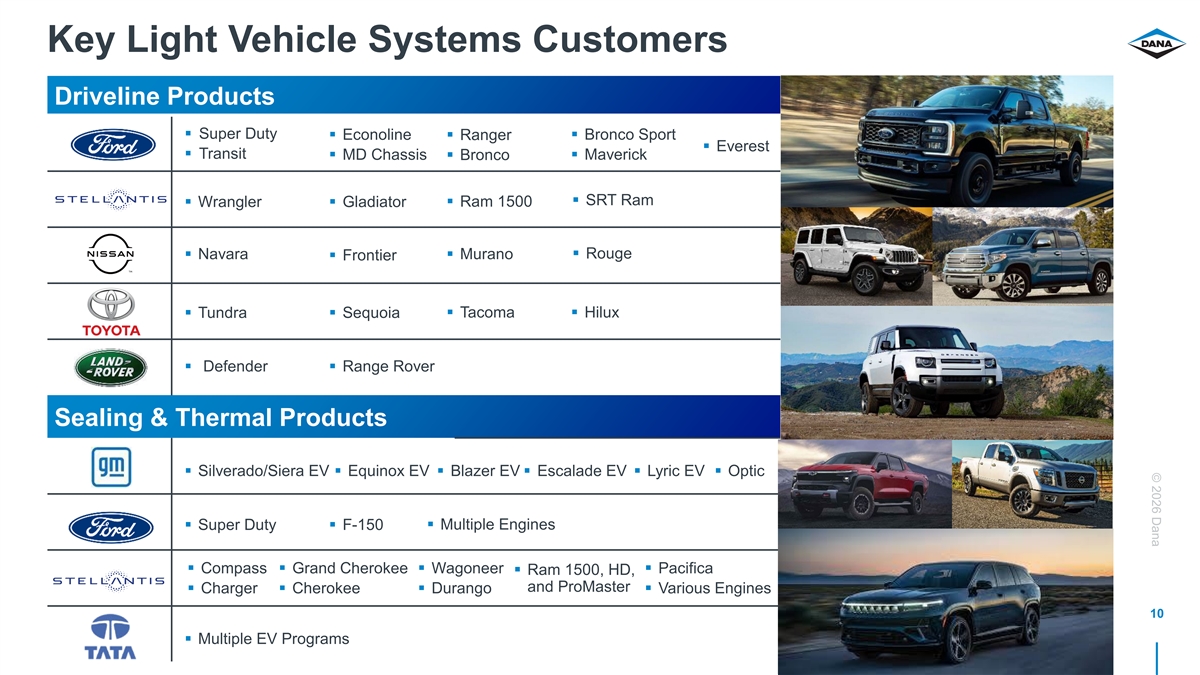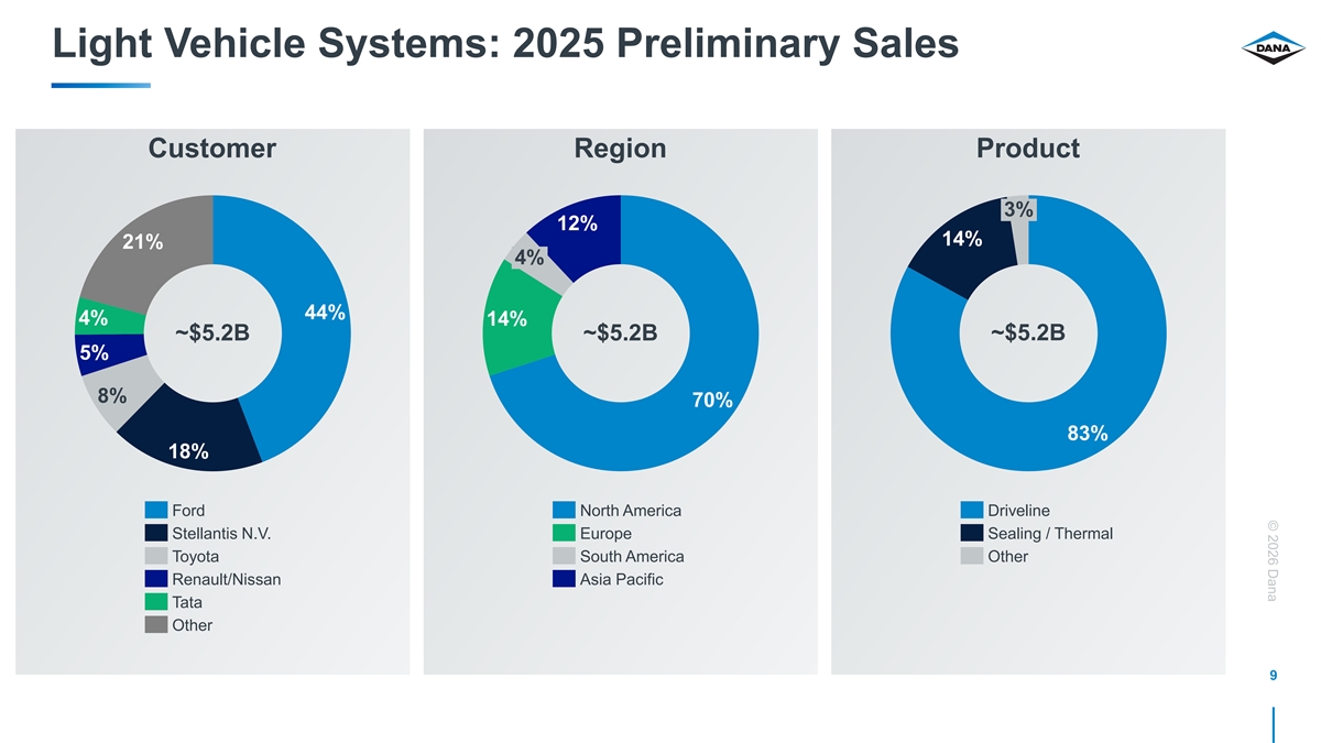 © 2026 Dana Light Vehicle Systems: 2025 Preliminary Sales Customer Region Product 3% 12% 14% 21% 4% 44% 4% 14% ~$5.2B ~$5.2B ~$5.2B 5% 8% 70% 83% 18% Ford North America Driveline Stellantis N.V. Europe Sealing / Thermal Toyota South America Other Renault/Nissan Asia Pacific Tata Other 9