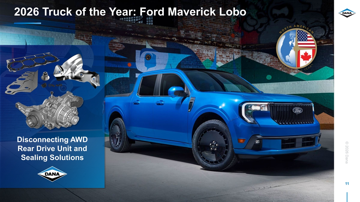 © 2026 Dana Key Light Vehicle Systems Customers Driveline Products § Super Duty § Econoline§ Bronco Sport § Ranger § Everest § Transit§ Maverick § MD Chassis§ Bronco § SRT Ram § Wrangler§ Gladiator§ Ram 1500 § Rouge § Navara§ Murano § Frontier § Tundra§ Sequoia§ Tacoma§ Hilux § Defender§ Range Rover Sealing & Thermal Products § Silverado/Siera EV§ Equinox EV§ Blazer EV§ Escalade EV§ Lyric EV§ Optic § Super Duty§ F-150§ Multiple Engines § Compass§ Grand Cherokee§ Wagoneer§ Pacifica § Ram 1500, HD, and ProMaster § Charger§ Cherokee§ Durango§ Various Engines 10 § Multiple EV Programs