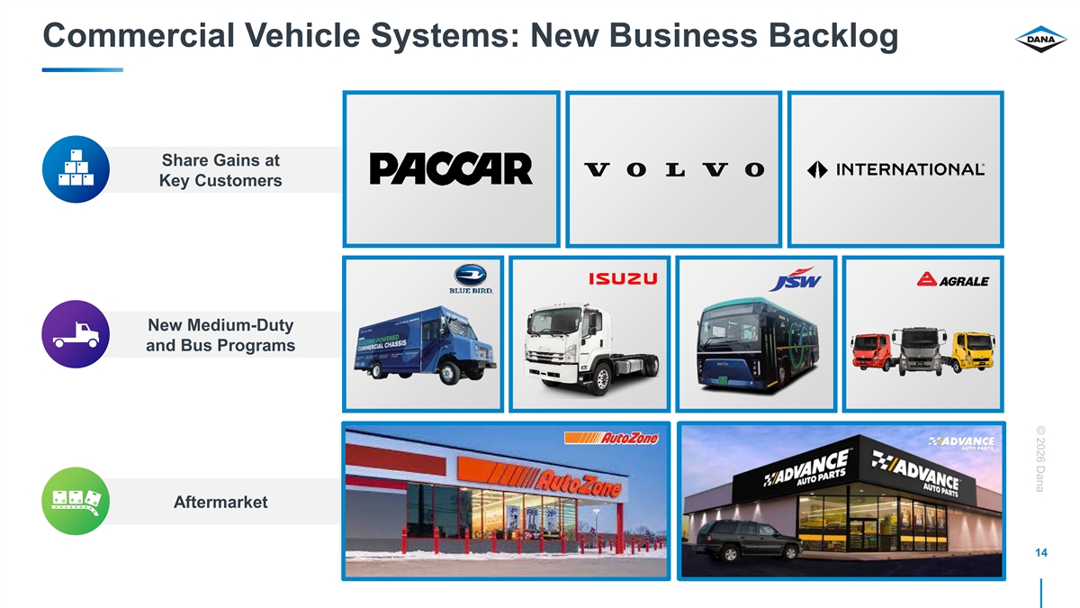 © 2026 Dana Commercial Vehicle Systems: New Business Backlog Share Gains at Key Customers New Medium-Duty and Bus Programs Aftermarket 14