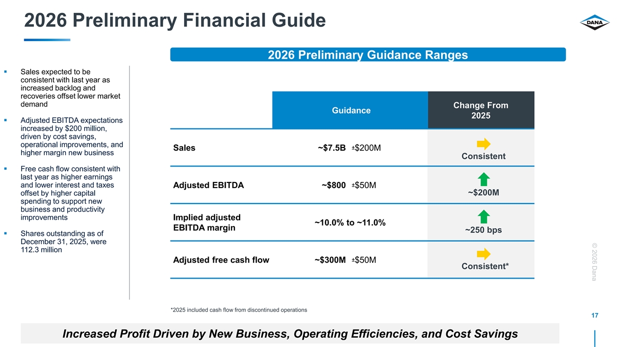 © 2026 Dana 2025 Preliminary Financial Results Fourth-Quarter Preliminary Results Full-Year Preliminary Results sales sales High-End of guidance range adjusted EBITDA adjusted EBITDA High-End of guidance range margin margin High-End of guidance range adjusted free cash flow adjusted free cash flow High-End of guidance range 16 2025 Preliminary Results at High-End of Expectations