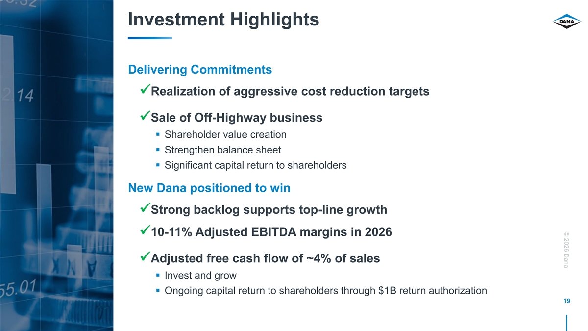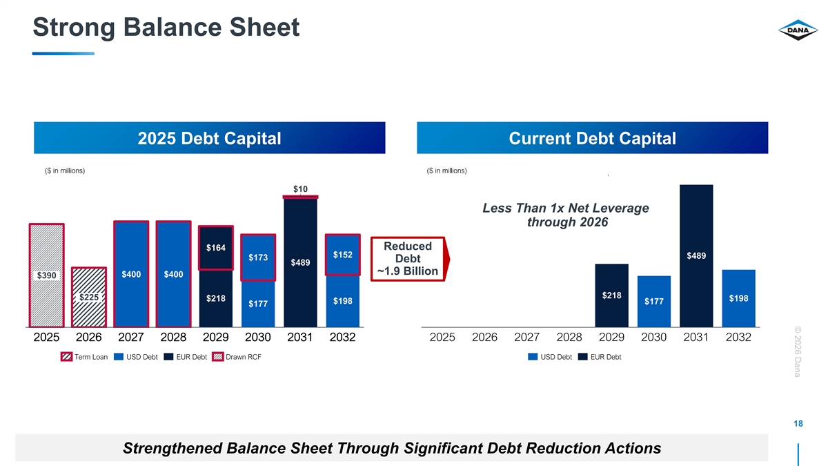 © 2026 Dana Strong Balance Sheet 2025 Debt Capital Current Debt Capital ($ in millions) ($ in millions) $10 Less Than 1x Net Leverage through 2026 Reduced $164 $152 $489 $173 Debt $489 ~1.9 Billion $400 $400 $390 $218 $225 $218 $198 $198 $177 $177 2025 2026 2027 2028 2029 2030 2031 2032 2025 2026 2027 2028 2029 2030 2031 2032 Term Loan USD Debt EUR Debt Drawn RCF USD Debt EUR Debt 18 Strengthened Balance Sheet Through Significant Debt Reduction Actions Source: Dana