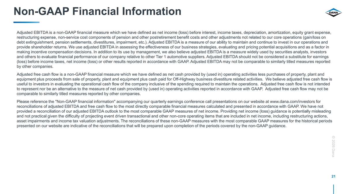 © 2026 Dana Non-GAAP Financial Information Adjusted EBITDA is a non-GAAP financial measure which we have defined as net income (loss) before interest, income taxes, depreciation, amortization, equity grant expense, restructuring expense, non-service cost components of pension and other postretirement benefit costs and other adjustments not related to our core operations (gain/loss on debt extinguishment, pension settlements, divestitures, impairment, etc.). Adjusted EBITDA is a measure of our ability to maintain and continue to invest in our operations and provide shareholder returns. We use adjusted EBITDA in assessing the effectiveness of our business strategies, evaluating and pricing potential acquisitions and as a factor in making incentive compensation decisions. In addition to its use by management, we also believe adjusted EBITDA is a measure widely used by securities analysts, investors and others to evaluate financial performance of our company relative to other Tier 1 automotive suppliers. Adjusted EBITDA should not be considered a substitute for earnings (loss) before income taxes, net income (loss) or other results reported in accordance with GAAP. Adjusted EBITDA may not be comparable to similarly titled measures reported by other companies. Adjusted free cash flow is a non-GAAP financial measure which we have defined as net cash provided by (used in) operating activities less purchases of property, plant and equipment plus proceeds from sale of property, plant and equipment plus cash paid for Off-Highway business divestiture related activities. We believe adjusted free cash flow is useful to investors in evaluating the operational cash flow of the company inclusive of the spending required to maintain the operations. Adjusted free cash flow is not intended to represent nor be an alternative to the measure of net cash provided by (used in) operating activities reported in accordance with GAAP. Adjusted free cash flow may not be comparable to similarly titled measures reported by other companies. Please reference the Non-GAAP financial information accompanying our quarterly earnings conference call presentations on our website at www.dana.com/investors for reconciliations of adjusted EBITDA and free cash flow to the most directly comparable financial measures calculated and presented in accordance with GAAP. We have not provided a reconciliation of our adjusted EBITDA outlook to the most comparable GAAP measures of net income. Providing net income (loss) guidance is potentially misleading and not practical given the difficulty of projecting event driven transactional and other non-core operating items that are included in net income, including restructuring actions, asset impairments and income tax valuation adjustments. The reconciliations of these non-GAAP measures with the most comparable GAAP measures for the historical periods presented on our website are indicative of the reconciliations that will be prepared upon completion of the periods covered by the non-GAAP guidance. 21