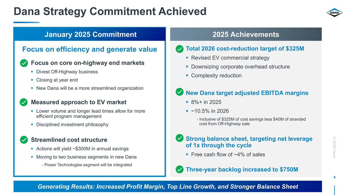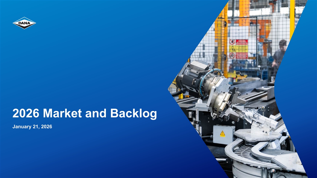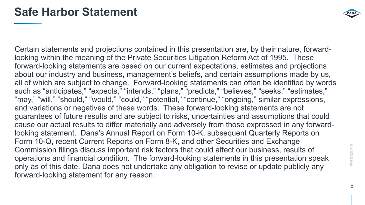 © 2026 Dana Safe Harbor Statement Certain statements and projections contained in this presentation are, by their nature, forward- looking within the meaning of the Private Securities Litigation Reform Act of 1995. These forward-looking statements are based on our current expectations, estimates and projections about our industry and business, management’s beliefs, and certain assumptions made by us, all of which are subject to change. Forward-looking statements can often be identified by words such as “anticipates,” “expects,” “intends,” “plans,” “predicts,” “believes,” “seeks,” “estimates,” “may,” “will,” “should,” “would,” “could,” “potential,” “continue,” “ongoing,” similar expressions, and variations or negatives of these words. These forward-looking statements are not guarantees of future results and are subject to risks, uncertainties and assumptions that could cause our actual results to differ materially and adversely from those expressed in any forward- looking statement. Dana’s Annual Report on Form 10-K, subsequent Quarterly Reports on Form 10-Q, recent Current Reports on Form 8-K, and other Securities and Exchange Commission filings discuss important risk factors that could affect our business, results of operations and financial condition. The forward-looking statements in this presentation speak only as of this date. Dana does not undertake any obligation to revise or update publicly any forward-looking statement for any reason. 2
