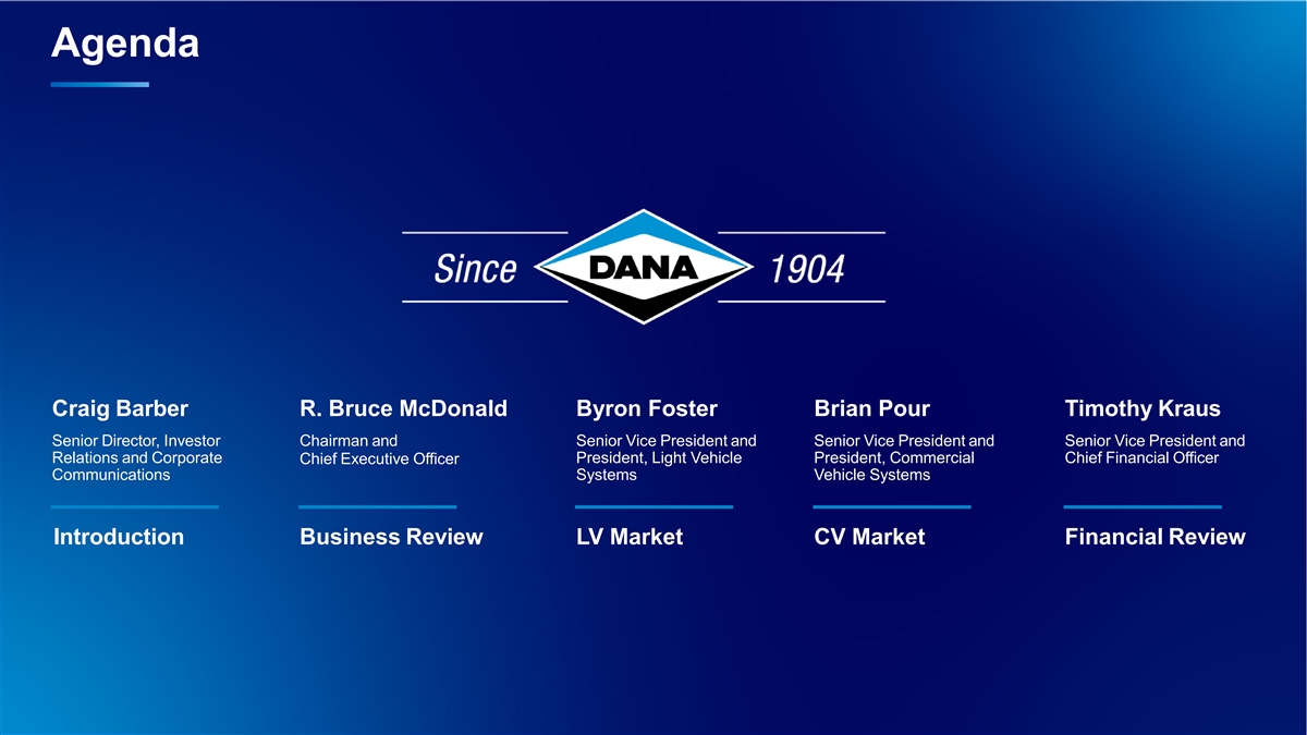 © 2026 Dana Agenda Craig Barber R. Bruce McDonald Byron Foster Brian Pour Timothy Kraus Senior Director, Investor Chairman and Senior Vice President and Senior Vice President and Senior Vice President and Relations and Corporate President, Light Vehicle President, Commercial Chief Financial Officer Chief Executive Officer Communications Systems Vehicle Systems Introduction Business Review LV Market CV Market Financial Review 3