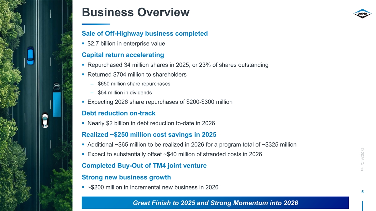 © 2026 Dana Dana Strategy Commitment Achieved January 2025 Commitment 2025 Achievements Total 2026 cost-reduction target of $325M Focus on efficiency and generate value § Revised EV commercial strategy Focus on core on-highway end markets § Downsizing corporate overhead structure § Divest Off-Highway business § Complexity reduction § Closing at year end § New Dana will be a more streamlined organization New Dana target adjusted EBITDA margins § 8%+ in 2025 Measured approach to EV market § Lower volume and longer lead times allow for more § ~10.5% in 2026 efficient program management - Inclusive of $325M of cost savings less $40M of stranded cost from Off-Highway sale § Disciplined investment philosophy Strong balance sheet, targeting net leverage Streamlined cost structure of 1x through the cycle § Actions will yield ~$300M in annual savings § Free cash flow of ~4% of sales § Moving to two business segments in new Dana - Power Technologies segment will be integrated Three-year backlog increased to $750M 4 Generating Results: Increased Profit Margin, Top Line Growth, and Stronger Balance Sheet